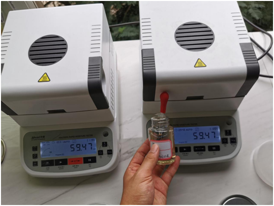 測(cè)試目的:聚天冬氨酸是一種氨基酸聚合物,天然存在于蝸牛和軟體動(dòng)物殼內(nèi),聚天冬氨酸是生物降解性好的、環(huán)境友好型化學(xué)品。聚天冬氨酸用途廣泛。在水處理、醫(yī)藥、農(nóng)業(yè)、日化等領(lǐng)域都能找到它的用途。聚天冬氨酸作為一種新型綠色水處理劑,應(yīng)用于工業(yè)循環(huán)冷卻水處理領(lǐng)域;聚天冬氨酸本身不是肥料,但它可以作肥料增效劑;聚天冬氨酸同時(shí)具有分散作用并可有效防止金屬設(shè)備的腐蝕等等。但是合格的聚天冬氨酸溶液固含量應(yīng)在40%以上,我們將通過(guò)兩臺(tái)固含量測(cè)試儀同時(shí)測(cè)試對(duì)比,驗(yàn)證三瓶聚天冬氨酸試劑中的可溶固體含量。