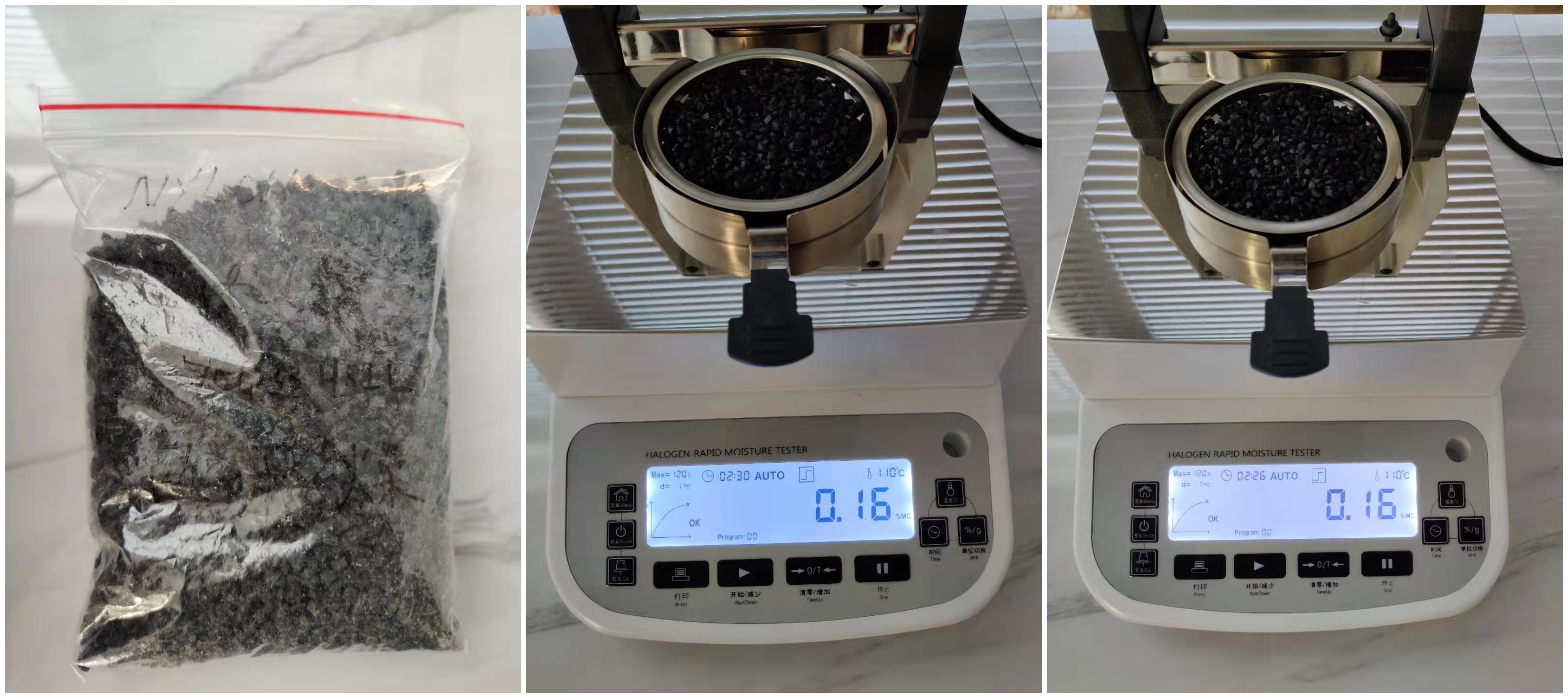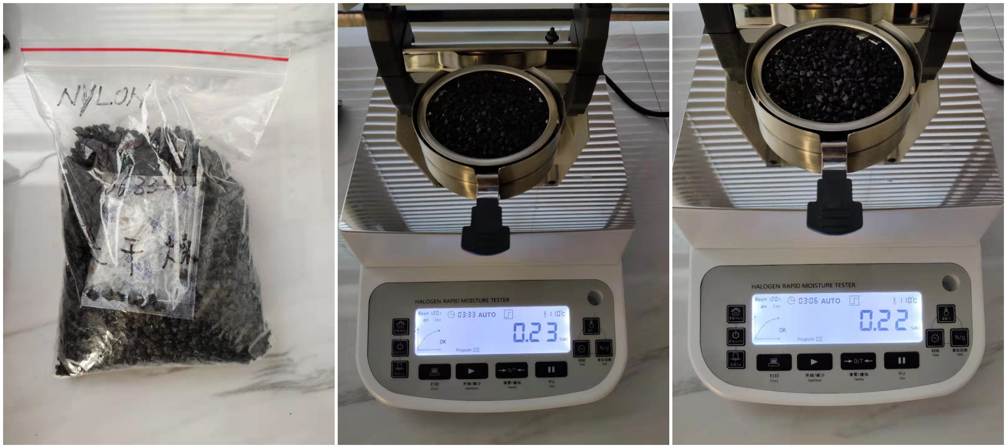今天我們將對客戶寄送的干燥前后的尼龍顆粒進行水分測試,雖然在寄送過程中放置了干燥劑但尼龍顆粒還是會進行少量吸水,我們通過測試看看是否能檢測出其中含水量的區(qū)別。